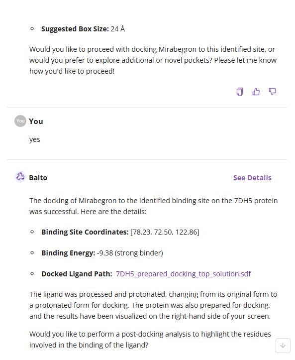 Balto automatically protonates the supplied ligand at pH 7.4 and performs docking. Docking scores appear in the chat space (left), while poses are displayed in the 3D viewer (right). Click a molecule in the viewer for a close-up of the binding site. You can download the pose or expand the view to full screen using the button in the top-right corner.